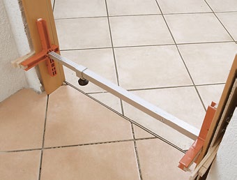 Podboje poravnamo. Za poravnavo uporabite dolgo vodno libelo. Kontrolirajte nagib v vseh smereh in uravnajte podboj. Fiksirajte ga z lesnimi klini.